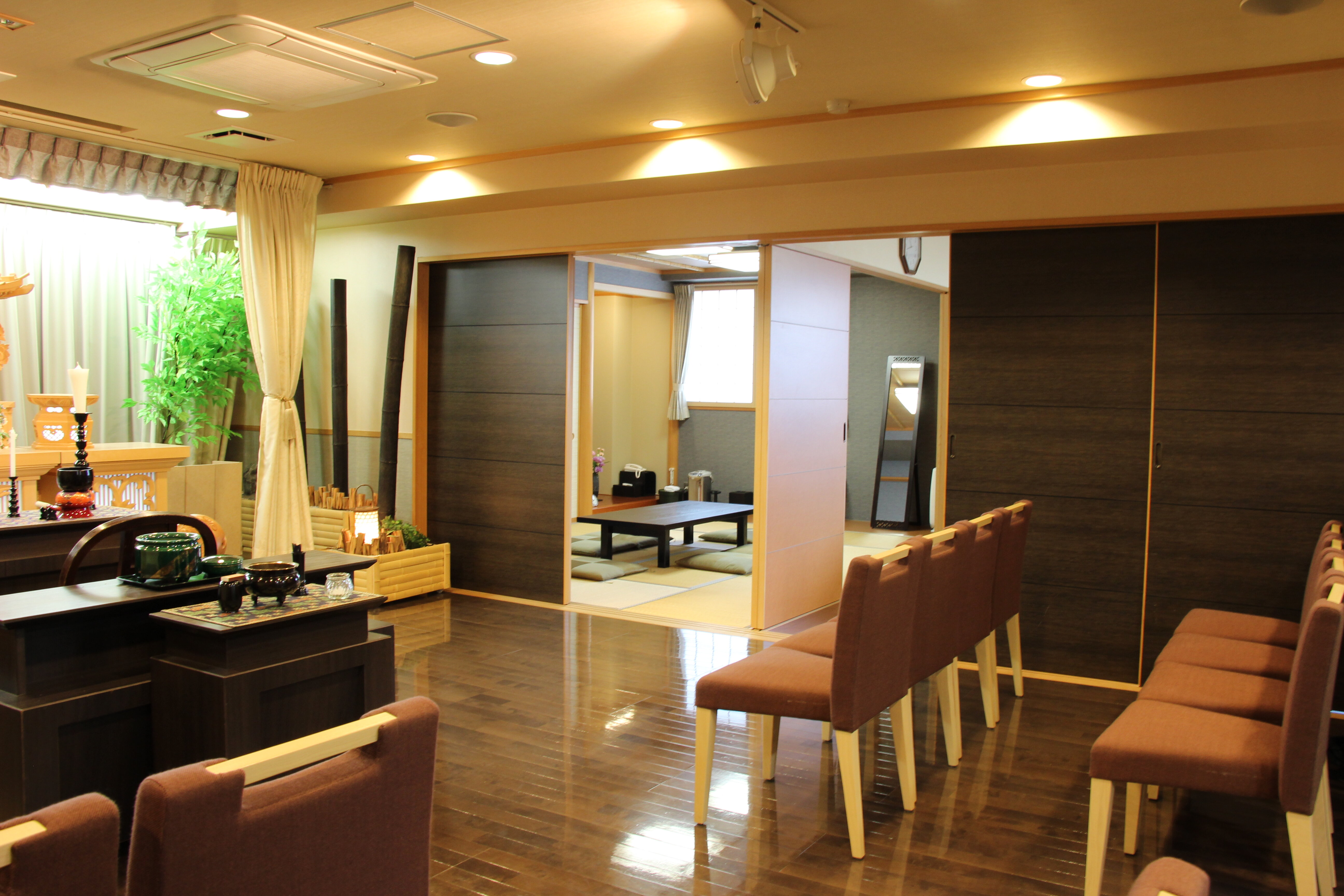 ご自宅感覚でくつろげる和モダンのゆったりとした空間は家族葬に最適です。宗旨・宗派を問わず、あらゆるタイプのご葬儀に対応いたします。