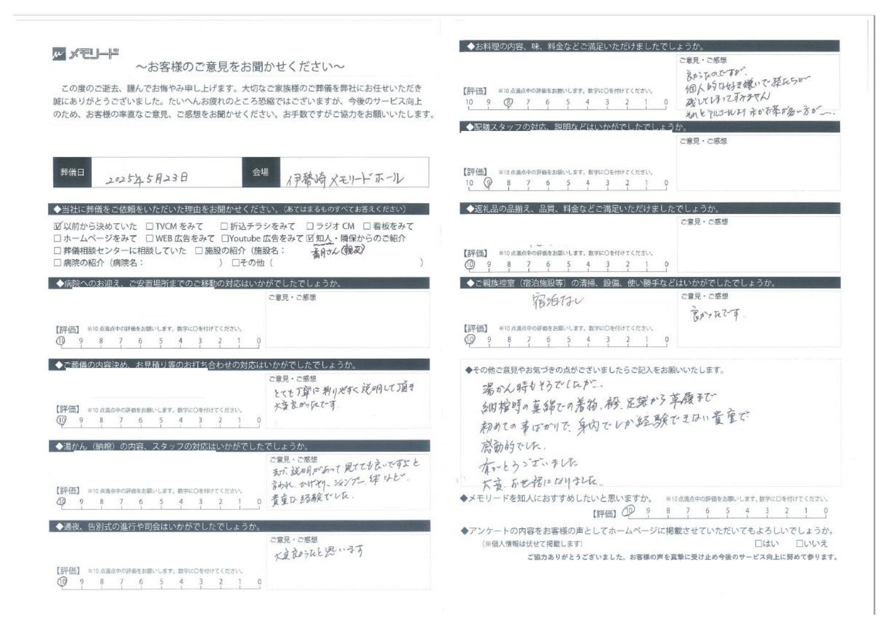 湯かん時もそうでしたが、納棺時の真綿での着物、袴、足袋から草履まで初めての事ばかりで、身内でしか経験できない貴重で感動的な体験が出来ました。 ありがとうございました。 大変お世話になりました。
