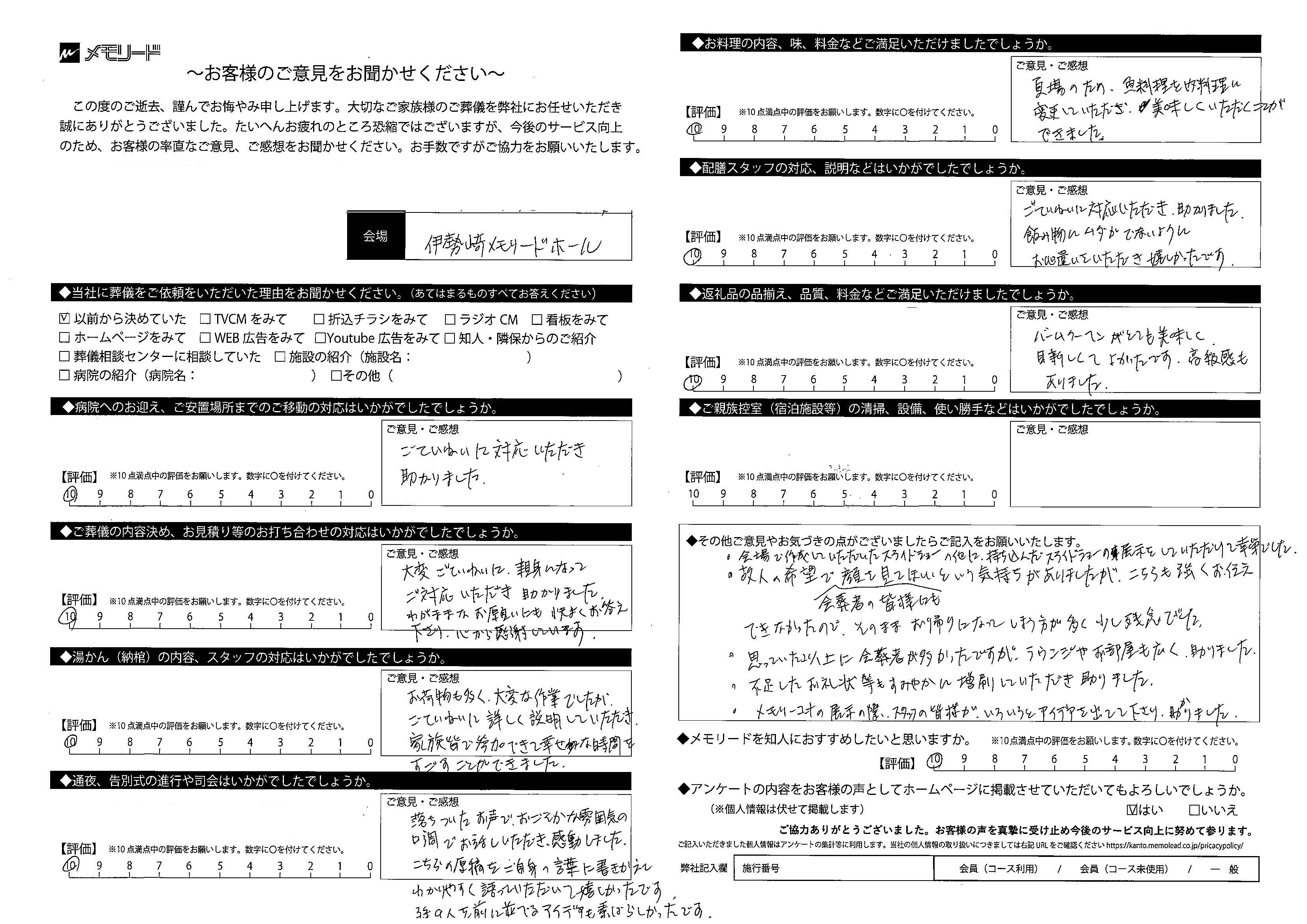 ・会場で作成していただいたスライドショーの他に、持ち込んだスライドショーの展示をしていただけて光栄でした。 ・故人の希望で会葬者の皆様にも顔を見てほしいという気持ちがありましたが、こちらも強くお伝えできなかったので、そのままお帰りになってしまう方が多く少し残念でした。 ・思っていた以上に会葬者が多かったですが、ラウンジやお部屋も広く助かりました。 ・不足したお礼状もすみやかに増刷していただき助かりました。 ・メモリーコーナーの展示の際、スタッフの皆様がいろいろとアイデアを出してくださり、助かりました。