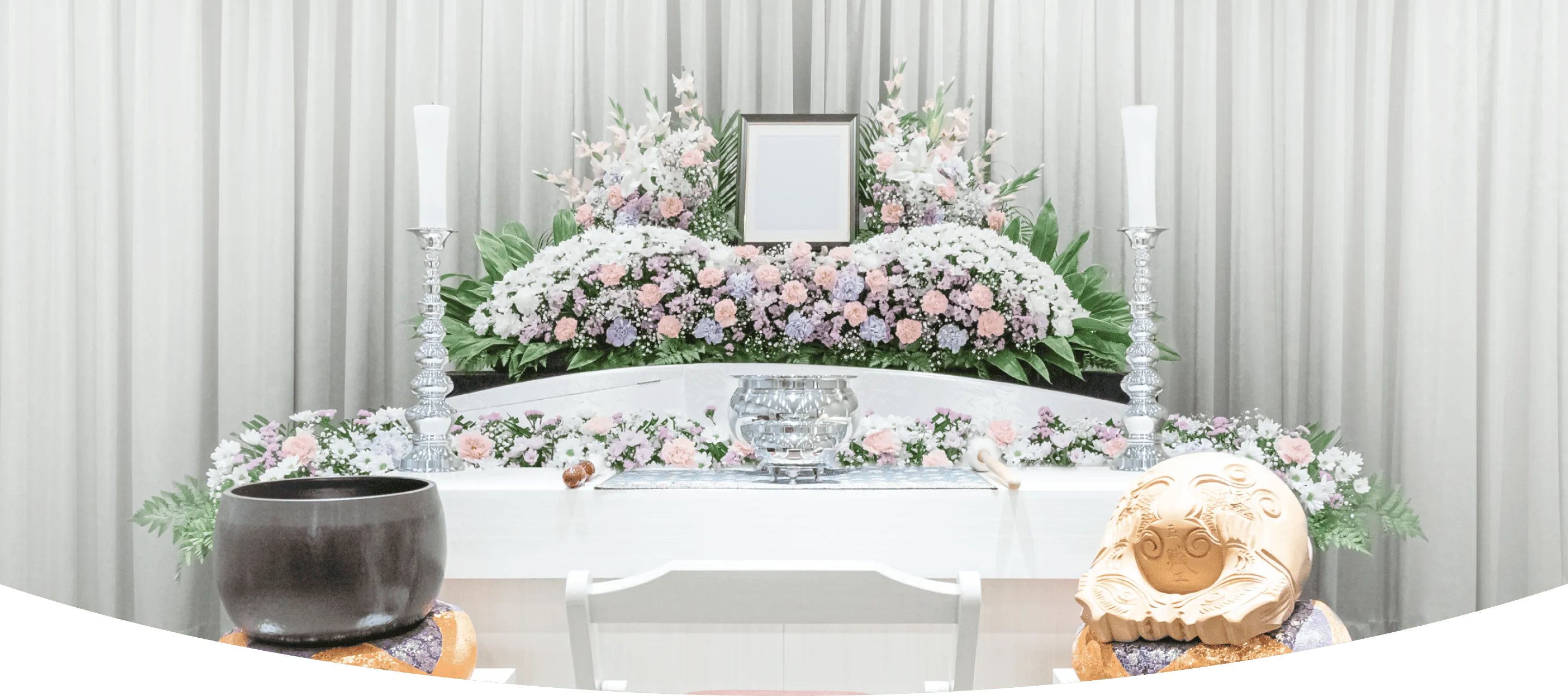 彩豊かな生花祭壇に、上質な棺とほ骨壷を用いた華やかさと安らぎを調和させたお別れを実現いたします。